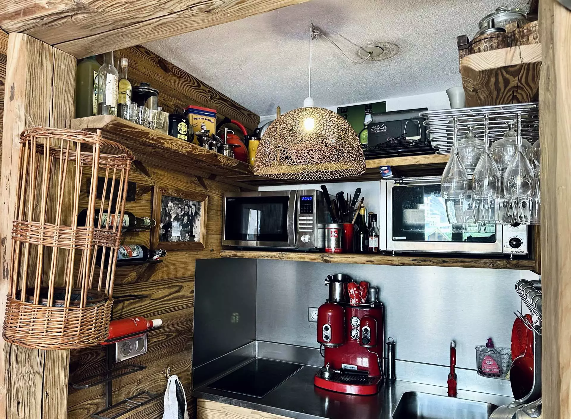 Es ist mit einem Cerankochfeld, einem Backofen, einem Kombi-Backofen/Mikrowelle und einem Kühlschrank ausgestattet.